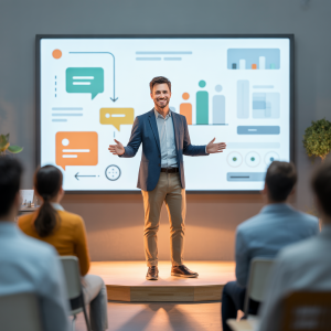 Construction de templates impactants et messages clés → Création de templates pré-formatés pour homogénéiser les supports de présentation → Conception d’une banque d’images et vidéos pour appuyer le discours → Mise en forme de discours courts, impactants, concrets. → Travail sur le storytelling et l’intention.